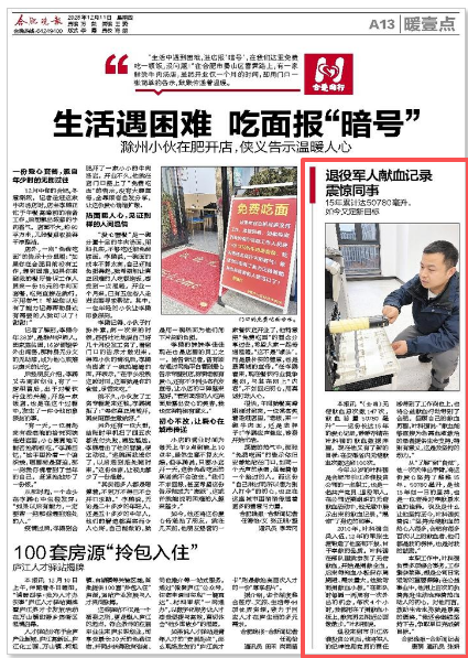 報(bào)道以《退役軍人獻(xiàn)血記錄 震驚同事》為題,生動講述了我公司員工葉科強(qiáng)——一位共產(chǎn)黨員、退役軍人,十五年來默默堅(jiān)持無償獻(xiàn)血的善舉。其累計(jì)獻(xiàn)血147次、總量達(dá)50780毫升的驚人記錄,充分展現(xiàn)了堅(jiān)韌不拔、熱心公益的崇高品質(zhì)。
