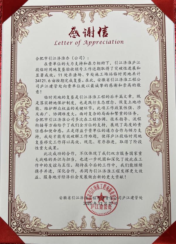 市引江濟(jì)淮辦副主任、市引江投資公司總經(jīng)理孔斌表示臨時(shí)用地復(fù)墾工作事關(guān)耕地保護(hù)、生態(tài)恢復(fù)和群眾權(quán)益,履職盡責(zé)是我司(辦)義不容辭的責(zé)任,這面錦旗與感謝信,既是對我司(辦)工作成效的充分肯定,更是對今后工作的莫大勉勵。我們期待與省引江濟(jì)淮集團(tuán)公司廬江建管處進(jìn)一步深化合作,凝聚更強(qiáng)合力,共同為引江濟(jì)淮工程早日全面發(fā)揮效益、持續(xù)服務(wù)地方經(jīng)濟(jì)社會高質(zhì)量發(fā)展做出新的更大貢獻(xiàn)!